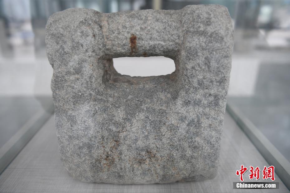 圖為鄉(xiāng)村農(nóng)耕博物館展柜里的撂石鎖。