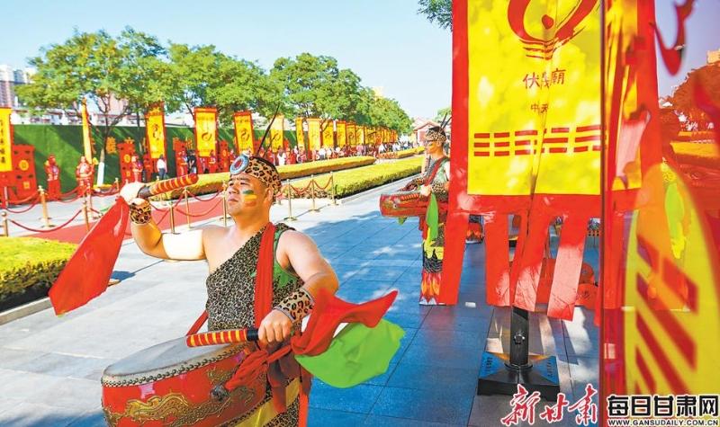 ▲舞者擊鼓迎接來自海內(nèi)外的華夏兒女共祭羲皇。新甘肅·甘肅日?qǐng)?bào)記者丁凱 攝