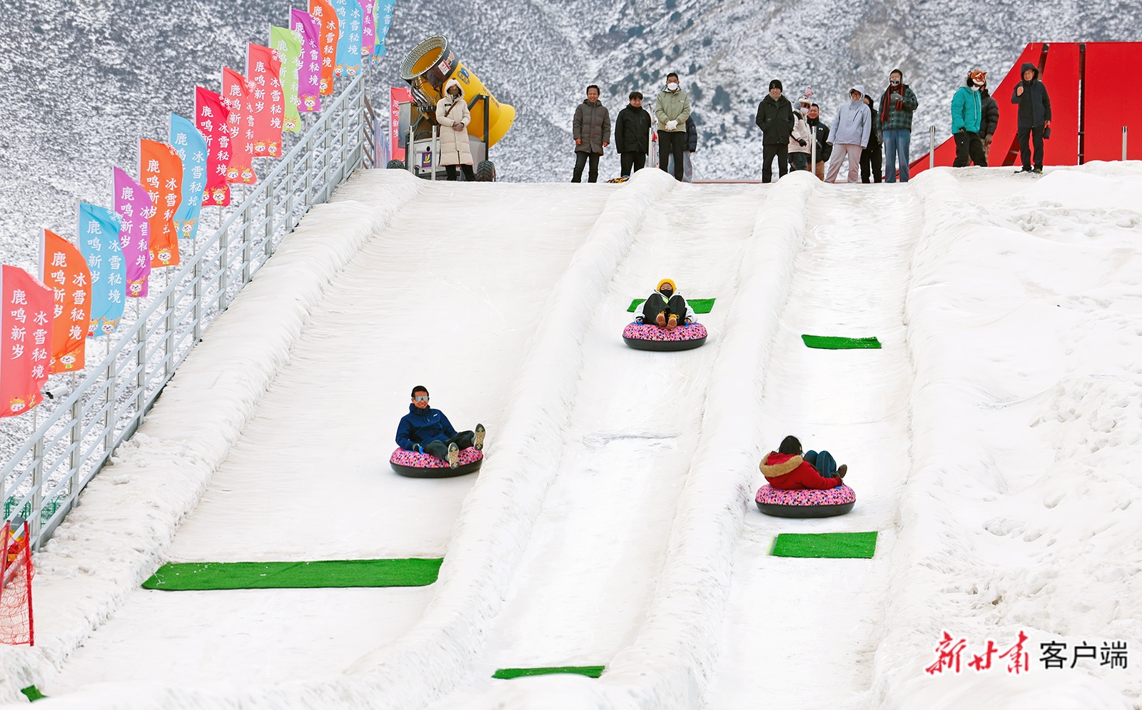 焉支山下,山丹佛山滑雪場,潔白的雪坡頂點,滑雪愛好者飛馳而下,盡享速度與激情;數位游客坐著雪圈向下俯沖,尖叫聲不斷……