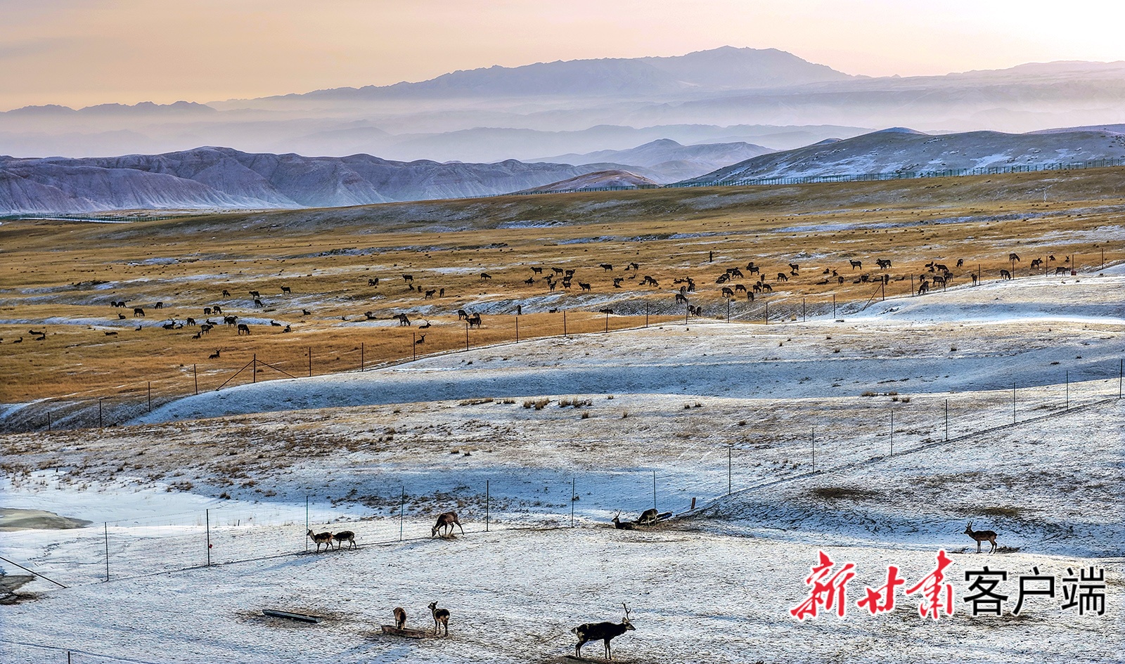神鹿冰雪樂園東側,遠山如黛、草原廣袤,成群馬鹿或追逐嬉戲,或悠閑覓食。雪上飛馳后的游客漫步棧道,愜意非常。