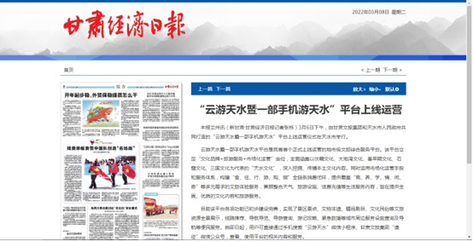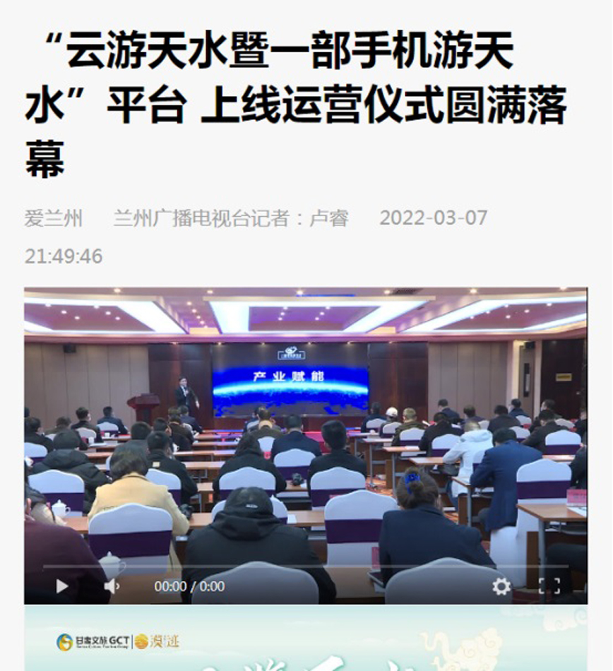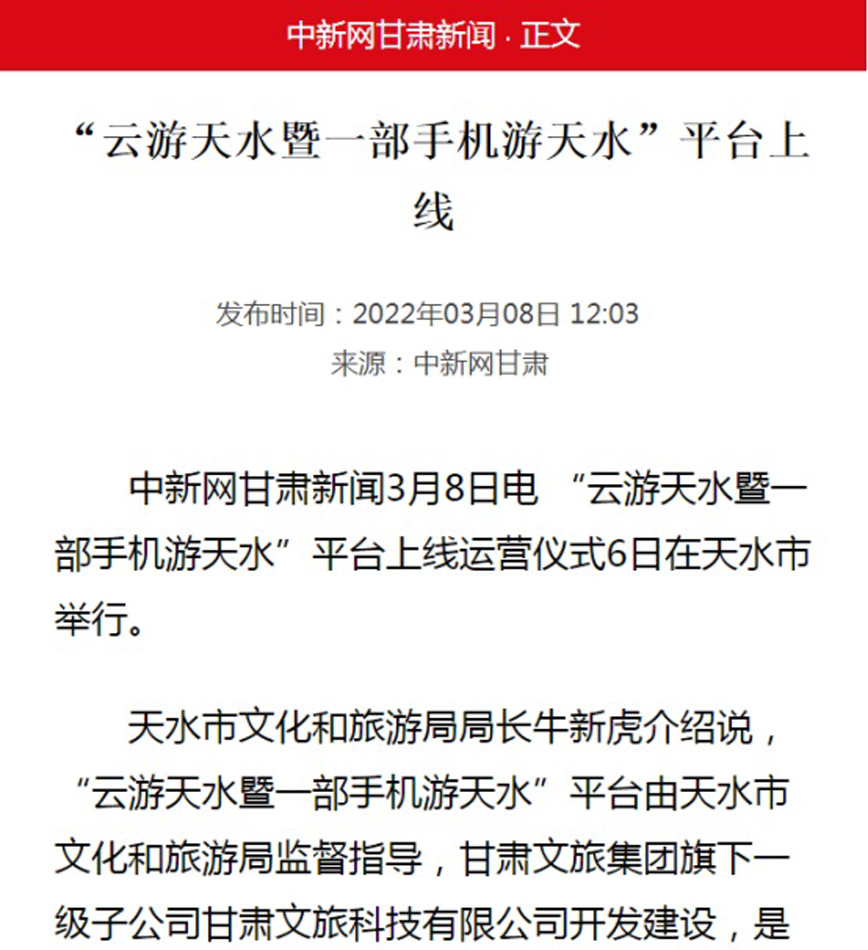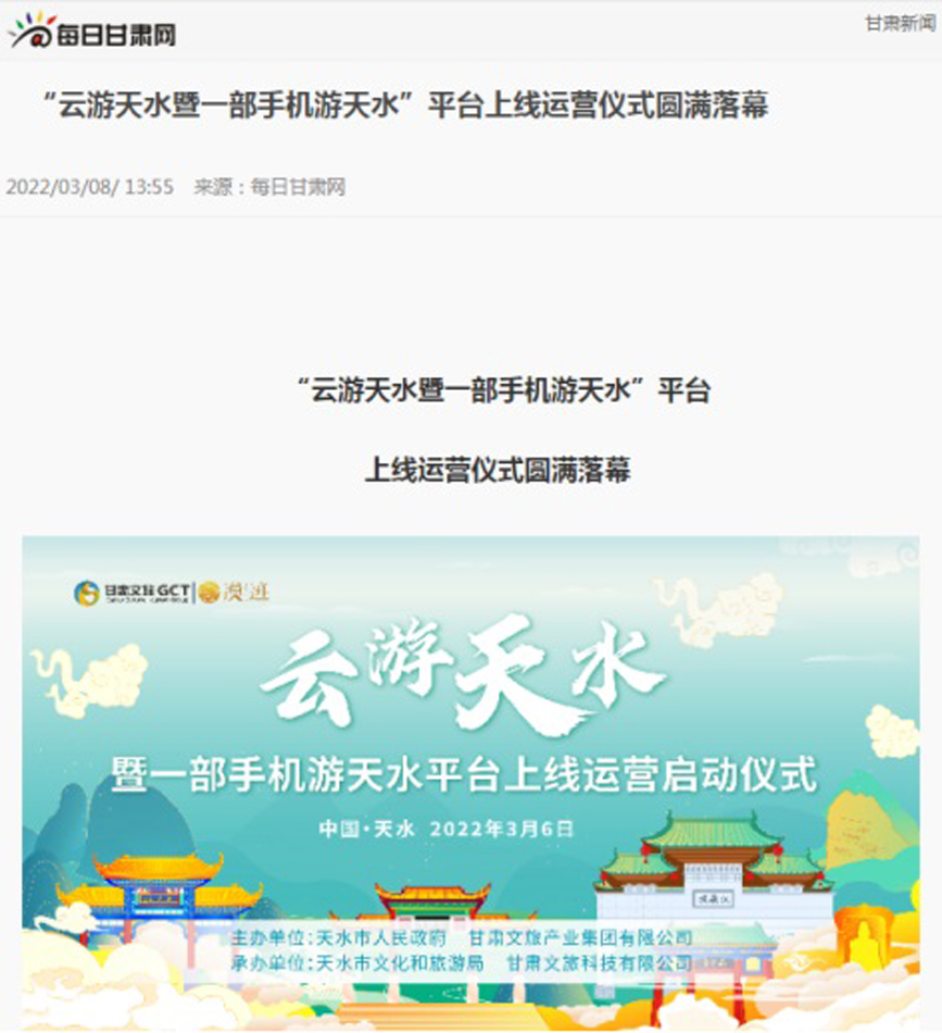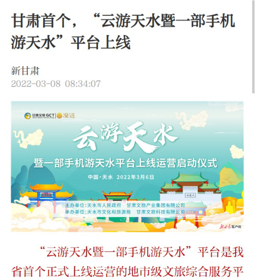 “云游天水暨一部手機(jī)游天水”平臺(tái)近期上線運(yùn)營(yíng),甘肅經(jīng)濟(jì)日?qǐng)?bào)、甘肅文化影視頻道、每日甘肅網(wǎng)、中新網(wǎng)甘肅新聞、新甘肅等多家省級(jí)媒體及蘭州廣播電視臺(tái)先后進(jìn)行宣傳報(bào)道,對(duì)“云游天水暨一部手機(jī)游天水”平臺(tái)作了介紹,并闡述了“云游天水暨一部手機(jī)游天水”在推動(dòng)天水智慧文化旅游發(fā)展,助推文旅產(chǎn)業(yè)轉(zhuǎn)型升級(jí)中的重要作用。