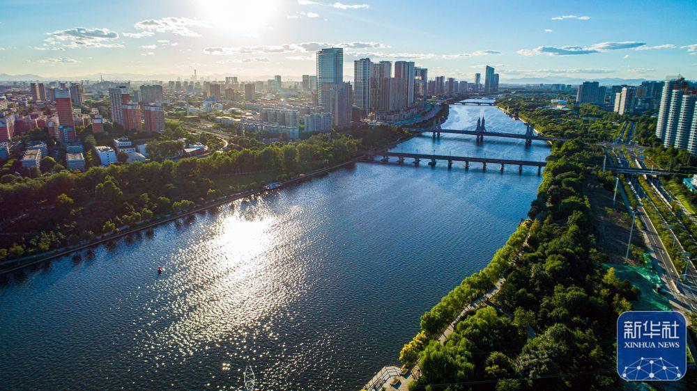 ↑這是在北京市通州區(qū)拍攝的橫跨大運(yùn)河的玉帶河橋(2022年8月15日攝,無(wú)人機(jī)照片)。新華社發(fā)(劉宇 攝)