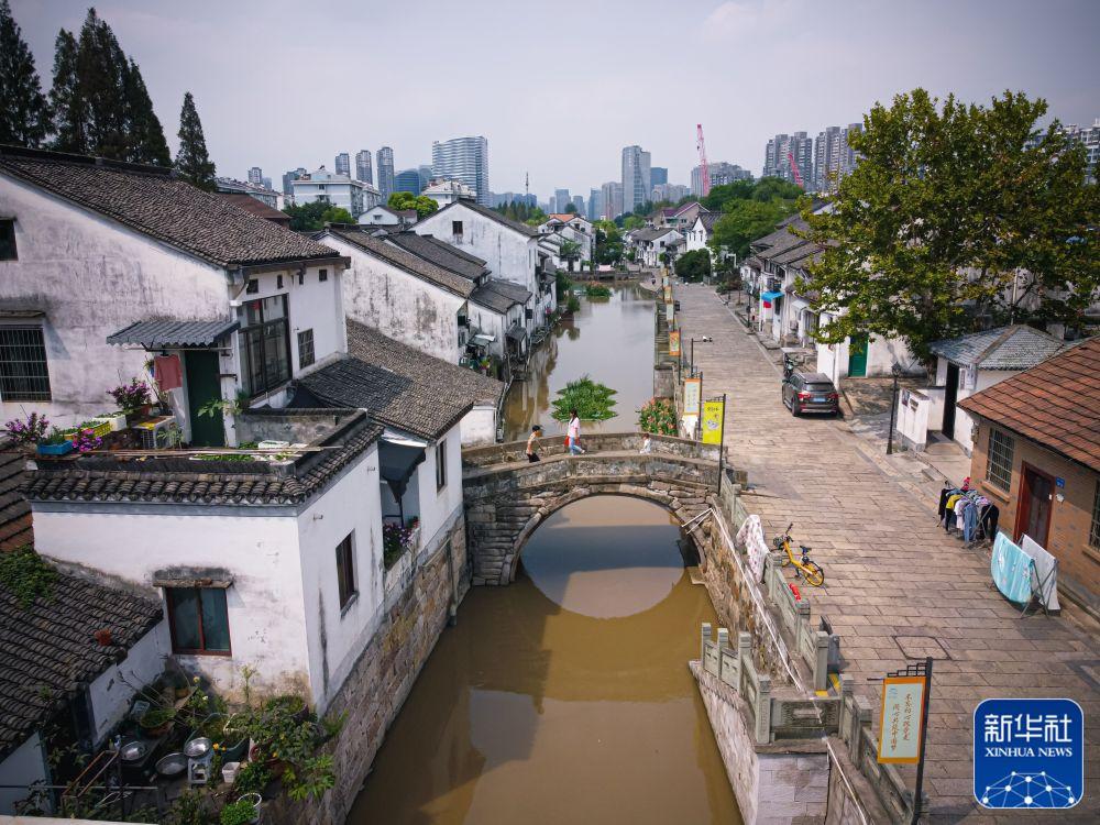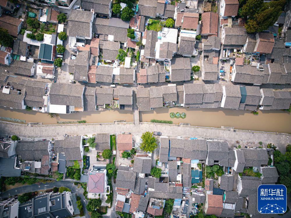 ↑從杭州西興老街流淌而過(guò)的浙東運(yùn)河(2022年9月27日攝,無(wú)人機(jī)照片)。新華社記者 江漢 攝