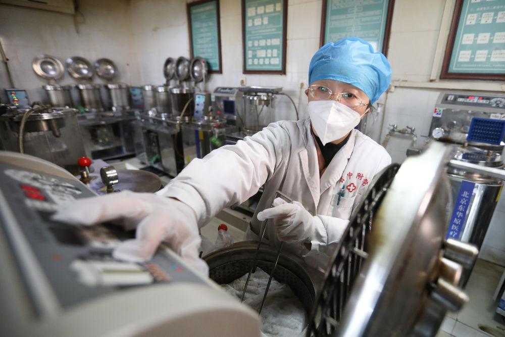 2022年12月23日,甘肅中醫(yī)藥大學(xué)附屬醫(yī)院醫(yī)務(wù)人員在煎藥室熬制中藥。新華社記者 馬希平 攝