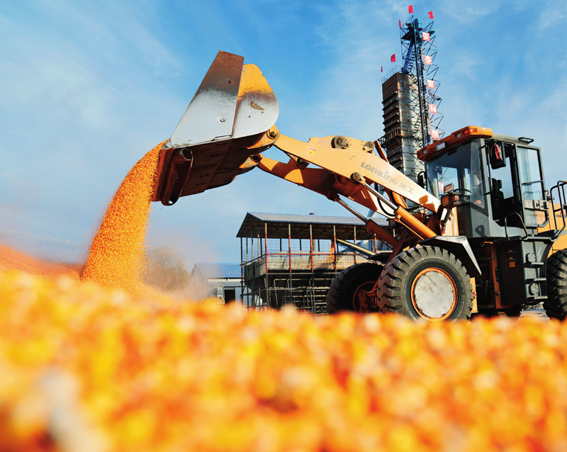 在北大荒農(nóng)墾集團(tuán)有限公司北安分公司趙光農(nóng)場(chǎng)有限公司,農(nóng)民駕駛鏟車(chē)在曬場(chǎng)傾倒玉米(2022 年 10 月 20 日攝) 王建威攝 / 本刊