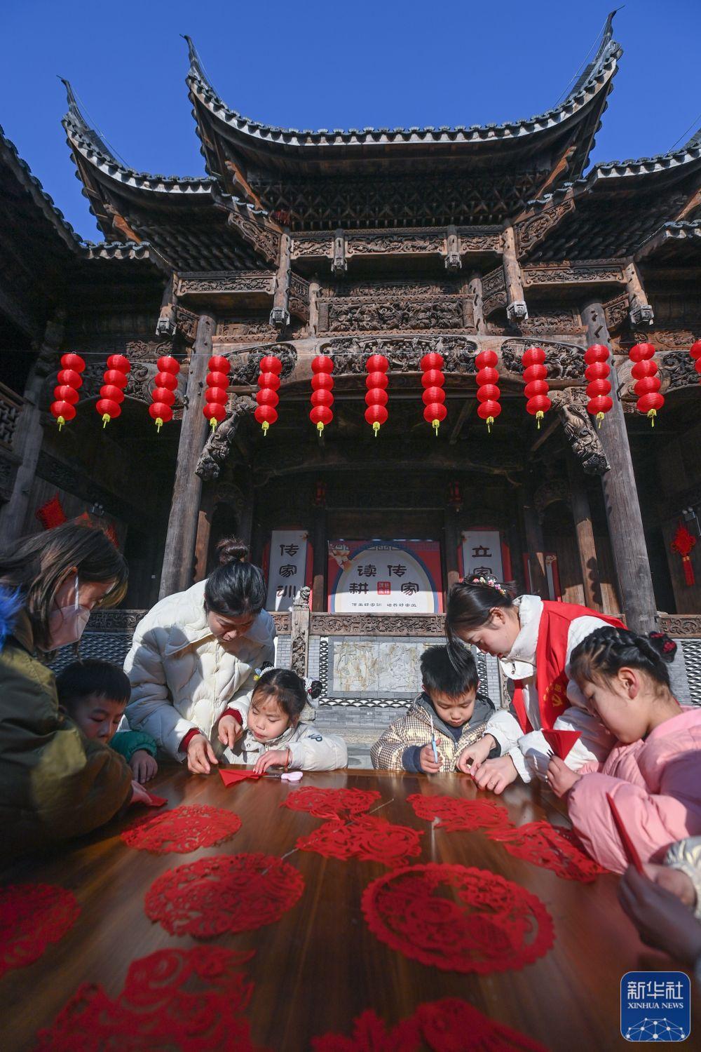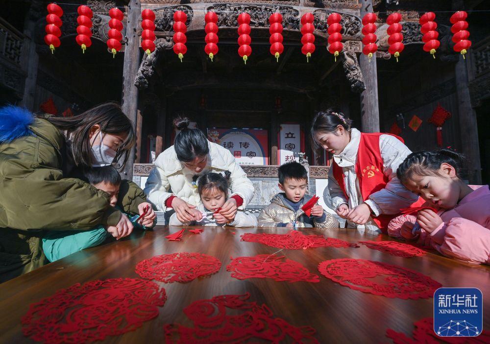 1月18日,在長興縣李家巷石泉村的古建筑“百桌廳”內(nèi),孩子們在教師志愿者的帶領下學習剪紙。