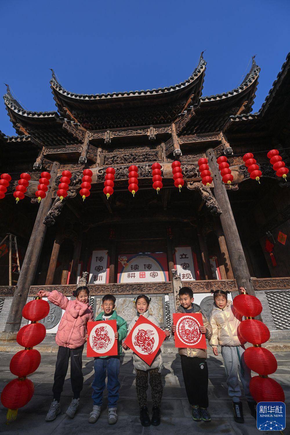 1月18日,在長興縣李家巷石泉村的古建筑“百桌廳”內(nèi),孩子們在展示各式各樣的兔年剪紙。