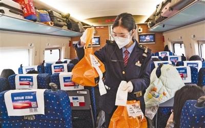 1月19日,G321次列車上,工作人員正在為旅客派送高鐵外賣。
