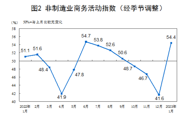 1月份,非制造業(yè)商務活動指數(shù)為54.4%,比上月上升12.8個百分點,重返擴張區(qū)間,非制造業(yè)景氣水平觸底回升。
