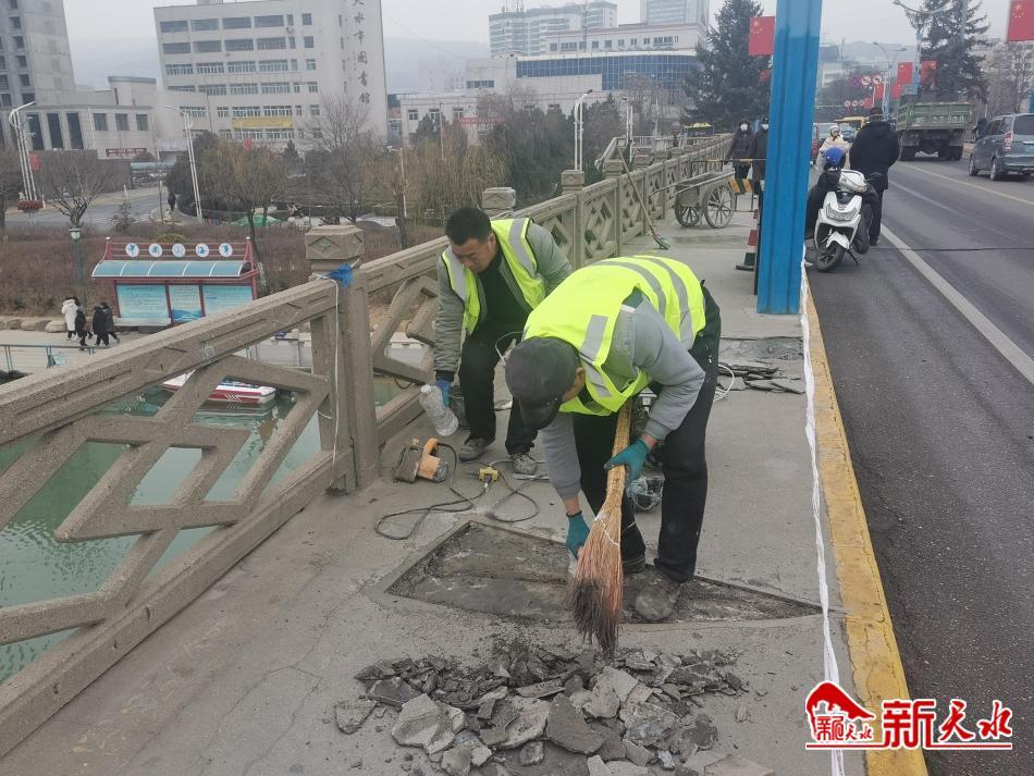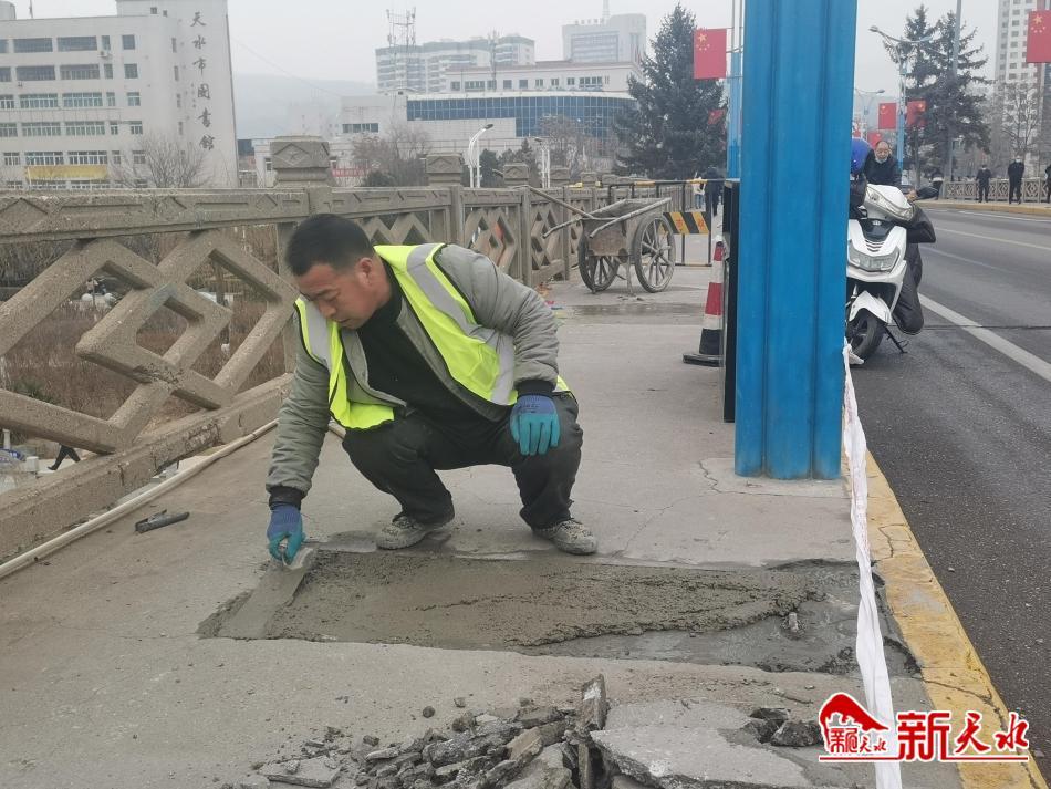 2月23日,市政人員正在秦州區(qū)南大橋修復(fù)破損的橋面人行道,以保障廣大人民群眾安全出行。新天水記者余碧波 攝