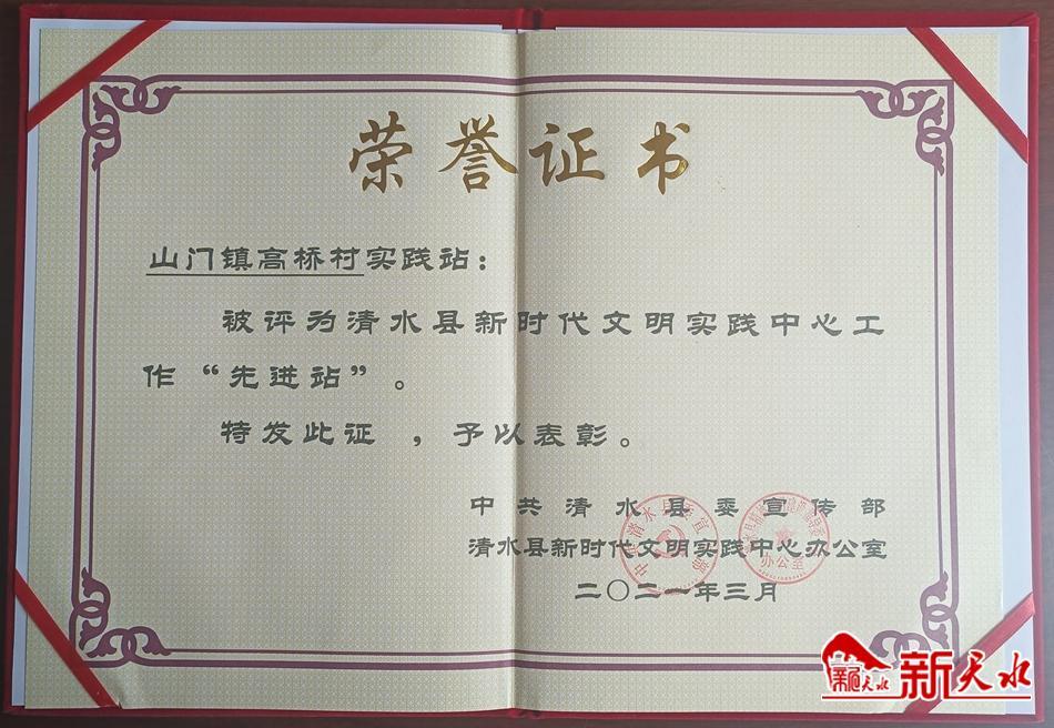 2021年3月,山門鎮(zhèn)高橋村新時(shí)代文明實(shí)踐站被清水縣評(píng)為“先進(jìn)站”,成為全縣的示范村之一,此項(xiàng)殊榮讓全村干部群眾備受鼓舞。