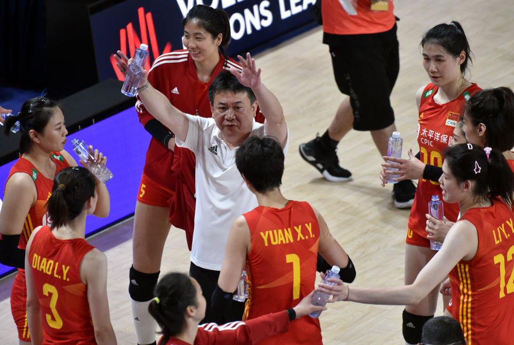 6月13日,2023世界女排聯(lián)賽中國香港站在香港體育館舉行,圖為中國隊(duì)主教練蔡斌(中)指導(dǎo)球員。新華社記者 盧炳輝 攝