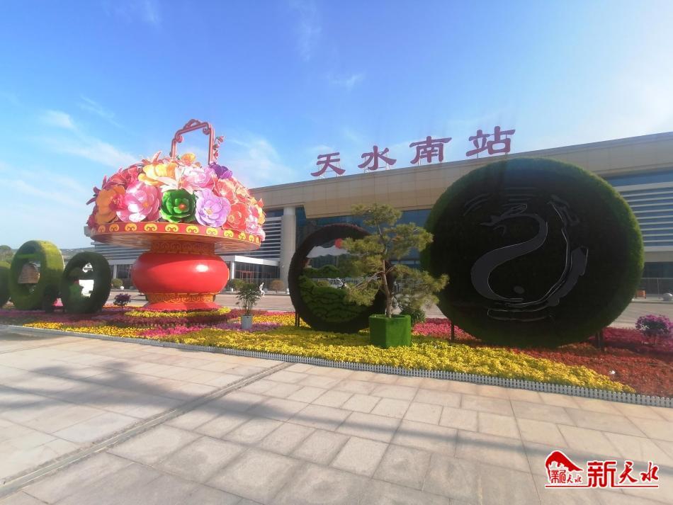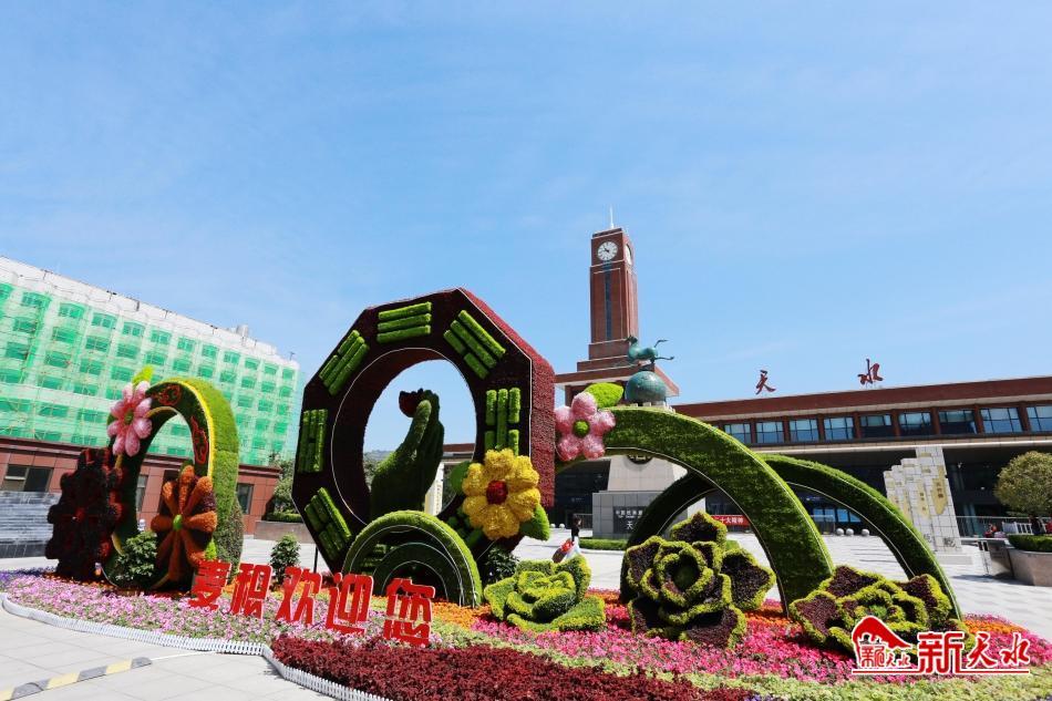 6月19日,記者在天水火車站廣場(chǎng)、馬跑泉市政廣場(chǎng)、渭河一號(hào)橋頭、天水南站站前廣場(chǎng)等地看到,以“麥積歡迎您”“隴上江南,生態(tài)麥積”“奮力建設(shè)宜居宜業(yè)宜游宜商新麥積”“天水歡迎您”為主題的4組大型綠色植物綠雕在藍(lán)色天空的掩映下,顯得格外亮麗,為城市街景增添了濃墨重彩。