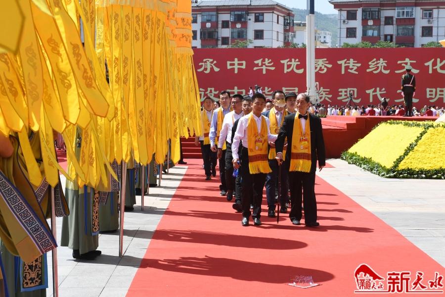 花團(tuán)錦簇,龍旗飄揚(yáng)。遠(yuǎn)道而來(lái)的海內(nèi)外賓朋,身披黃色綬帶,懷著虔誠(chéng)恭敬的心情,緩步走過(guò)伏羲廣場(chǎng),靜靜佇立,共同迎接盛典。