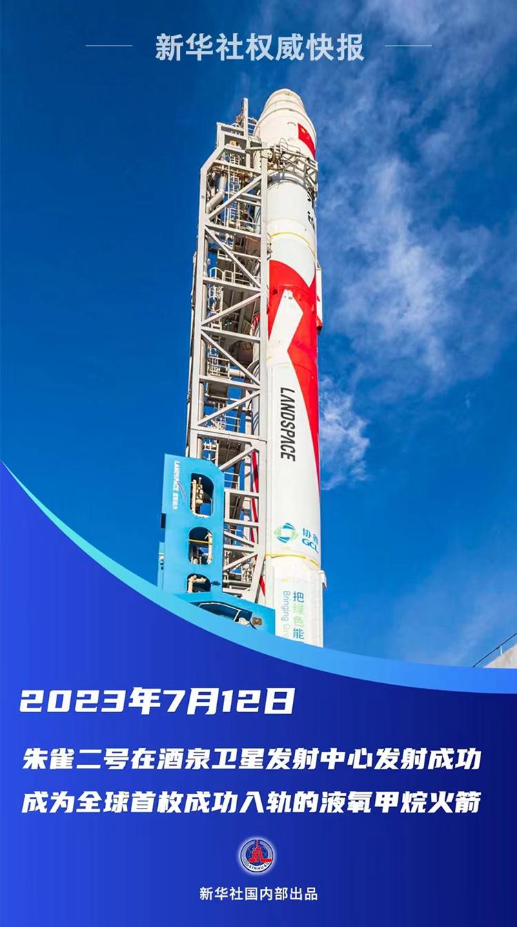 2023年7月12日上午,由藍(lán)箭航天空間科技股份有限公司自主研制的朱雀二號(hào)遙二液氧甲烷運(yùn)載火箭在酒泉衛(wèi)星發(fā)射中心發(fā)射升空,火箭進(jìn)入預(yù)定軌道,試驗(yàn)任務(wù)取得圓滿成功。