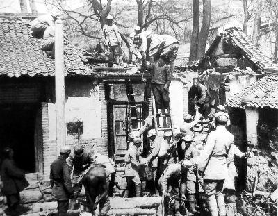 八路軍戰(zhàn)士為當?shù)厝罕娦扪a房屋。