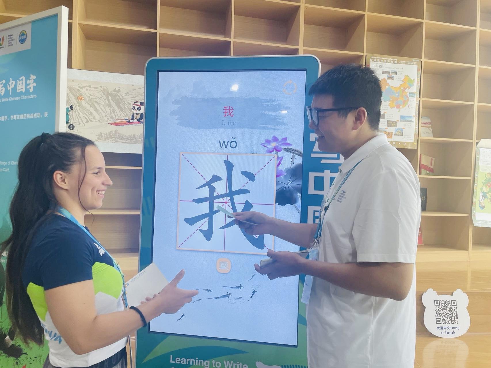 “你好”“再見”“謝謝”……在大運村“漢語橋”中文學(xué)習(xí)互動體驗區(qū),前來學(xué)習(xí)中文的運動員絡(luò)繹不絕。據(jù)悉,這里為各國參賽運動員準備了學(xué)唱中文歌、學(xué)說中國話、學(xué)寫中國字、學(xué)頌中國詩、學(xué)做中國菜等豐富的體驗活動,讓運動員們可以了解一些有趣的中國文化內(nèi)容,甚至還能學(xué)習(xí)幾句地道的成都話。
