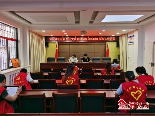 新天水訊【記者馬海林】為倡導(dǎo)婚嫁新風(fēng),讓青年樹立正確的婚戀觀、家庭觀,8月29日,秦州區(qū)中城街道辦伊民巷社區(qū)新時代文明實(shí)踐站組織志愿者和適齡未婚青年,開展了移風(fēng)易俗倡新座談會,進(jìn)一步引導(dǎo)廣大群眾樹立婚嫁新理念,并簽訂了“抵制高價彩禮承諾書”。
