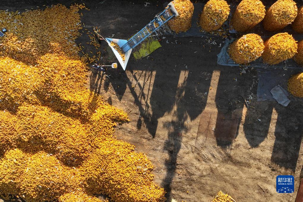10月5日,在河北省石家莊晉州市周家莊鄉(xiāng)第七生產(chǎn)隊(duì),農(nóng)民在晾曬收獲的玉米。新華社發(fā)(賈再興攝)