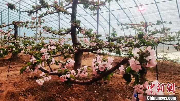 圖為秦州區(qū)玉泉鎮(zhèn)煙鋪村的日光溫室大棚內,一樹樹櫻桃爭相綻放的盛花期。(資料圖)劉武鋒 攝