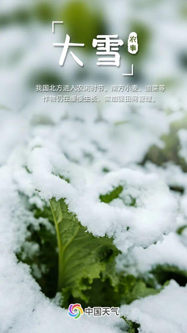 大雪節(jié)氣期間,由于氣溫進一步下降,降雪或積雪的概率都有所增加。小雪節(jié)氣,雪隨下隨融,而到了大雪節(jié)氣,雪隨下隨積,能“坐住了”。此時,新疆北部、西北地區(qū)東部、東北等地要警惕強風(fēng)雪天氣的出現(xiàn)。