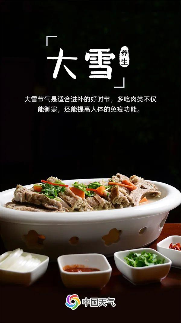 大雪也是適合進補的好時節(jié)。冬天的寒冷為放肆吃肉提供了充足的理由,肉類不僅能為我們的身體提供足夠的熱量以抵御嚴寒,還能提高人體的免疫功能,促進新陳代謝。不過,進補也要有“度”,除了吃肉,也要適當(dāng)吃一些新鮮的水果和蔬菜,做到營養(yǎng)均衡。