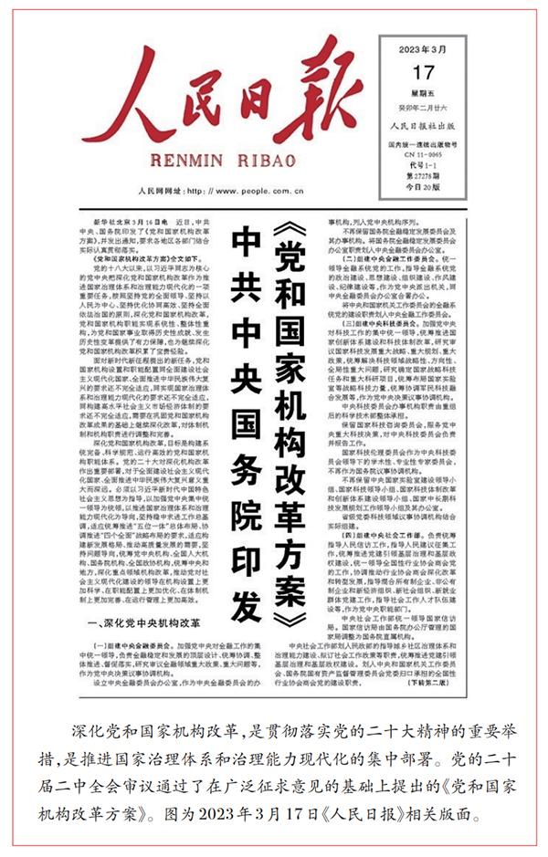 2023年2月,黨的二十屆二中全會(huì)審議通過《黨和國家機(jī)構(gòu)改革方案》,推動(dòng)黨對(duì)社會(huì)主義現(xiàn)代化建設(shè)的領(lǐng)導(dǎo)在機(jī)構(gòu)設(shè)置上更加科學(xué)、在職能配置上更加優(yōu)化、在體制機(jī)制上更加完善、在運(yùn)行管理上更加高效。