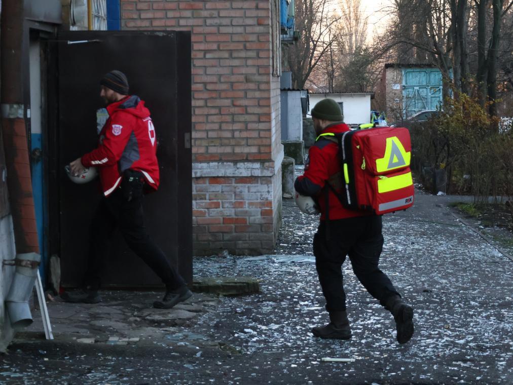 11月25日,烏克蘭紅十字會救援人員在基輔市一棟遭空襲的居民樓實施清理和救助工作。新華社發(fā)(羅曼·佩圖什科夫攝)
