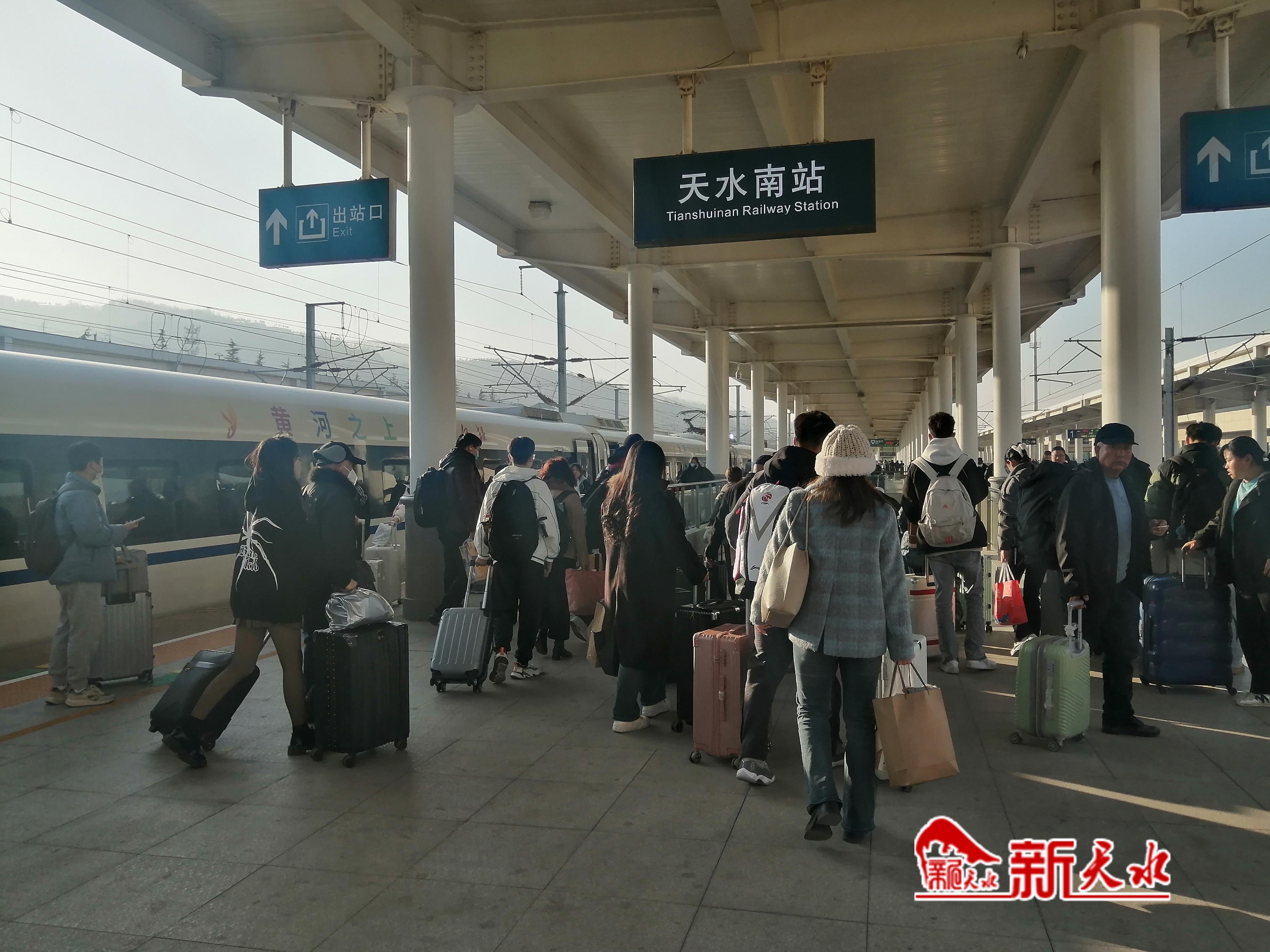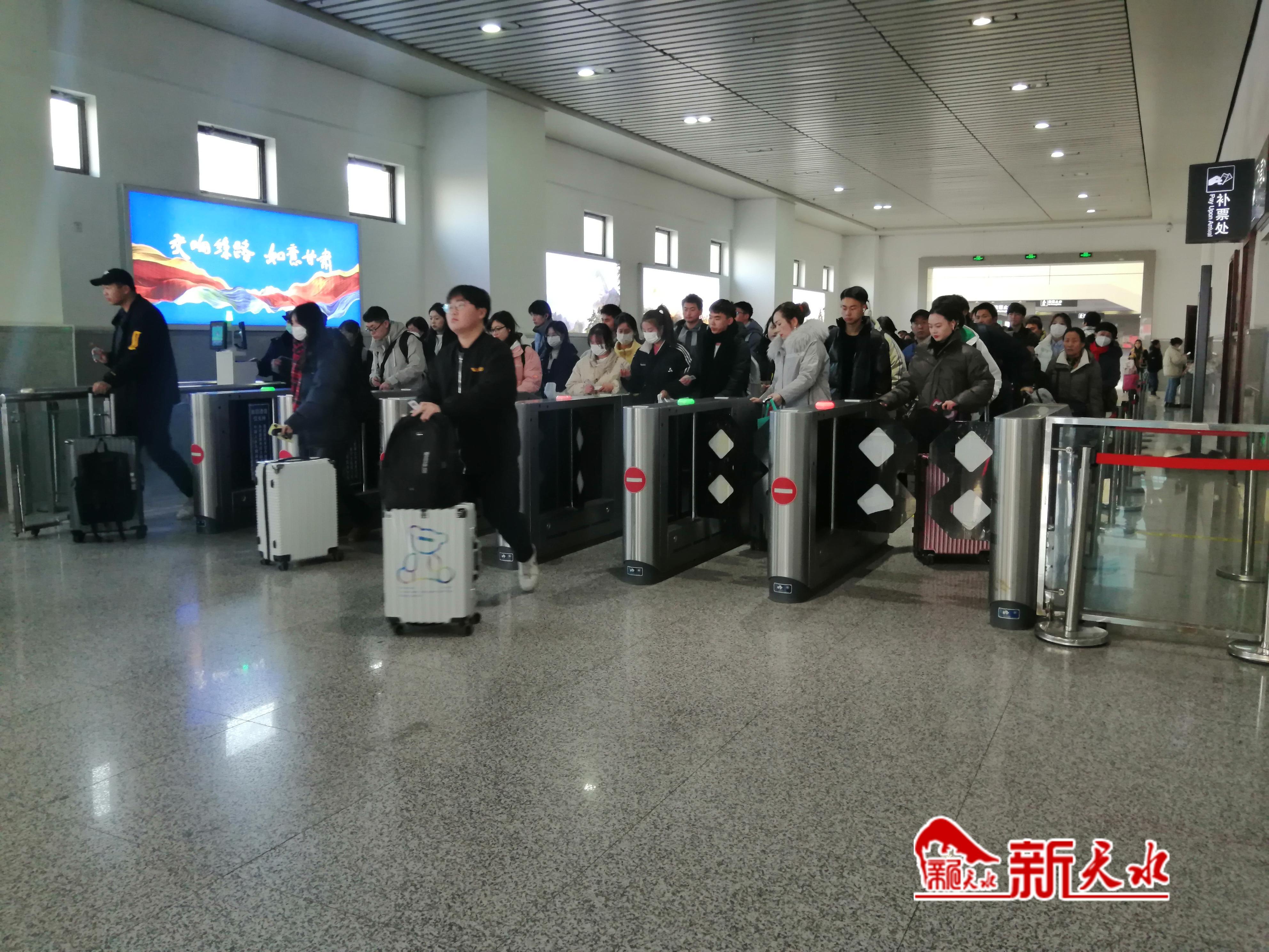 1月11日下午,記者在天水南站采訪時看到,北側站臺上有許多旅客正在排隊等待列車進站。在對面站臺,一趟從蘭州方向駛來的列車,下車的旅客人數(shù)明顯增多,旅客們提著大小行李箱通過地道來到出站口,然后有序排隊通過閘機出站。
