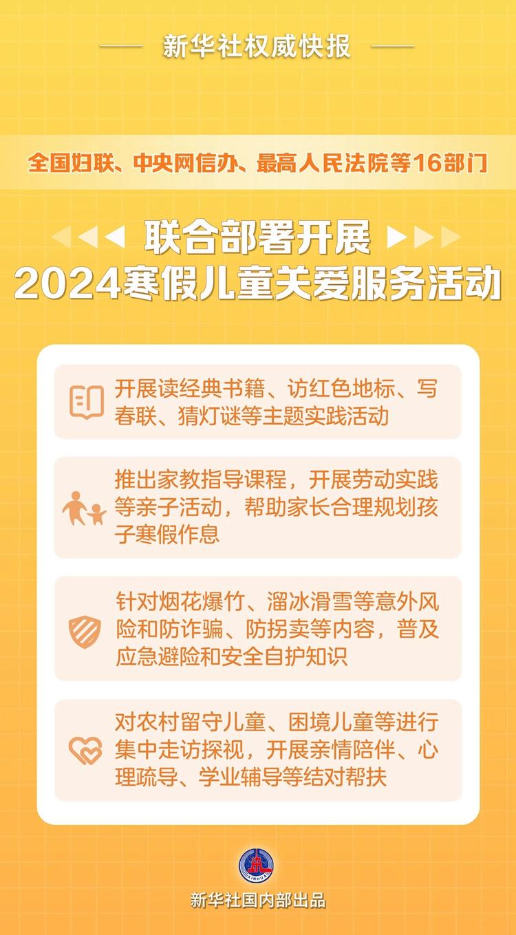 寒假即將到來(lái),全國(guó)婦聯(lián)、中央網(wǎng)信辦、最高人民法院、最高人民檢察院、教育部、公安部、民政部、司法部、國(guó)家衛(wèi)生健康委、應(yīng)急管理部、國(guó)家體育總局、國(guó)家疾控局、國(guó)家消防救援局、全國(guó)總工會(huì)、共青團(tuán)中央、中國(guó)關(guān)工委等16部門印發(fā)通知,圍繞思想引領(lǐng)潤(rùn)童心、家教指導(dǎo)育童心、安全教育護(hù)童心、愛(ài)心媽媽暖童心四個(gè)方面,聯(lián)合部署開(kāi)展“把愛(ài)帶回家——真情暖童心 相伴護(hù)成長(zhǎng)”2024寒假兒童關(guān)愛(ài)服務(wù)活動(dòng)。