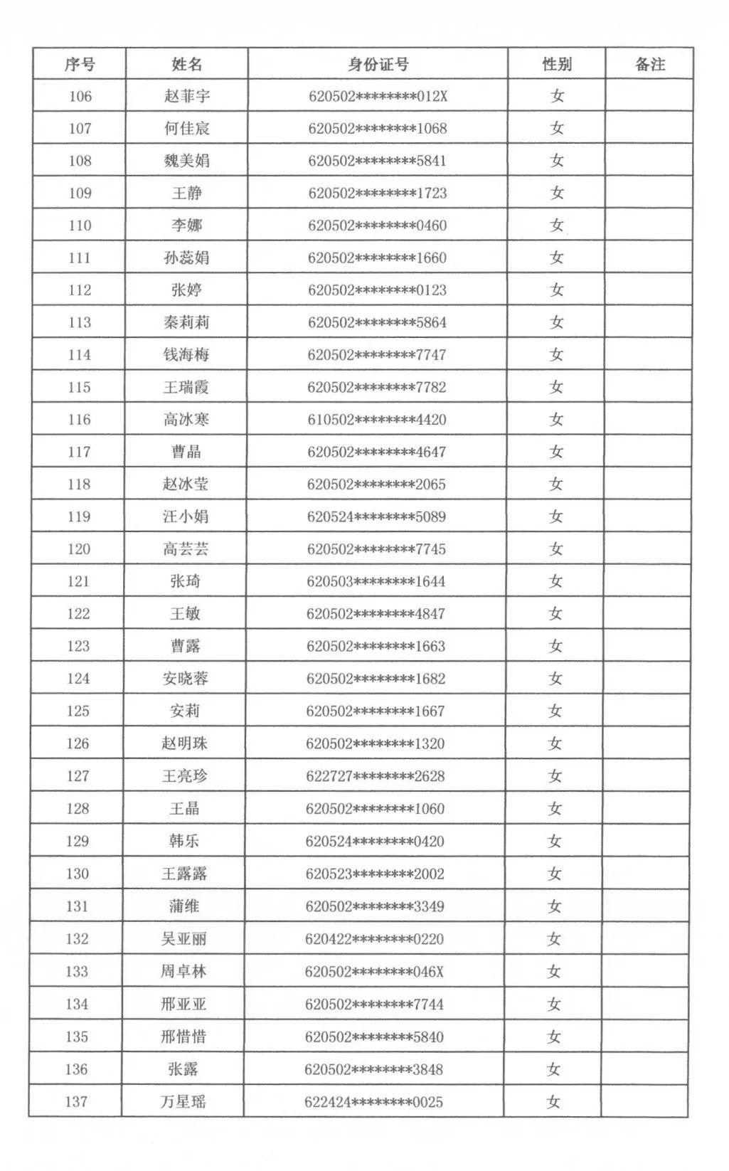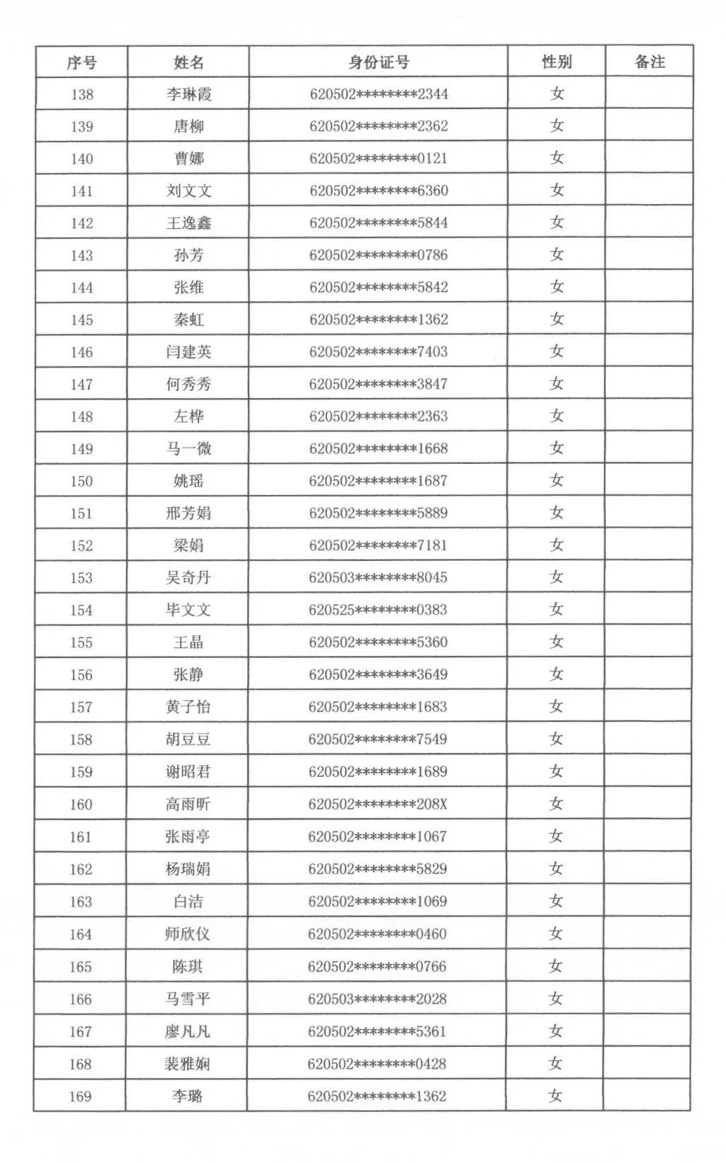 根據(jù)天水市秦州區(qū)人力資源和社會(huì)保障局、天水市公安局秦州分局關(guān)于2023年公開(kāi)招聘警務(wù)輔助人員工作安排,通過(guò)筆試、面試、體檢、政審,擬聘用警務(wù)輔助人員男性97名、女性72名,現(xiàn)將擬聘用人員名單公示如下,廣泛接受社會(huì)各界的監(jiān)督。公示期滿后,將按程序辦理聘用派遣手續(xù)。