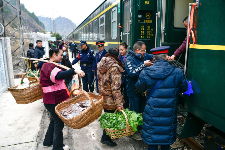 1月26日,在滬昆鐵路六個雞火車站,村民準備登上5640次列車售賣蔬菜和年貨。新華社記者 楊文斌 攝