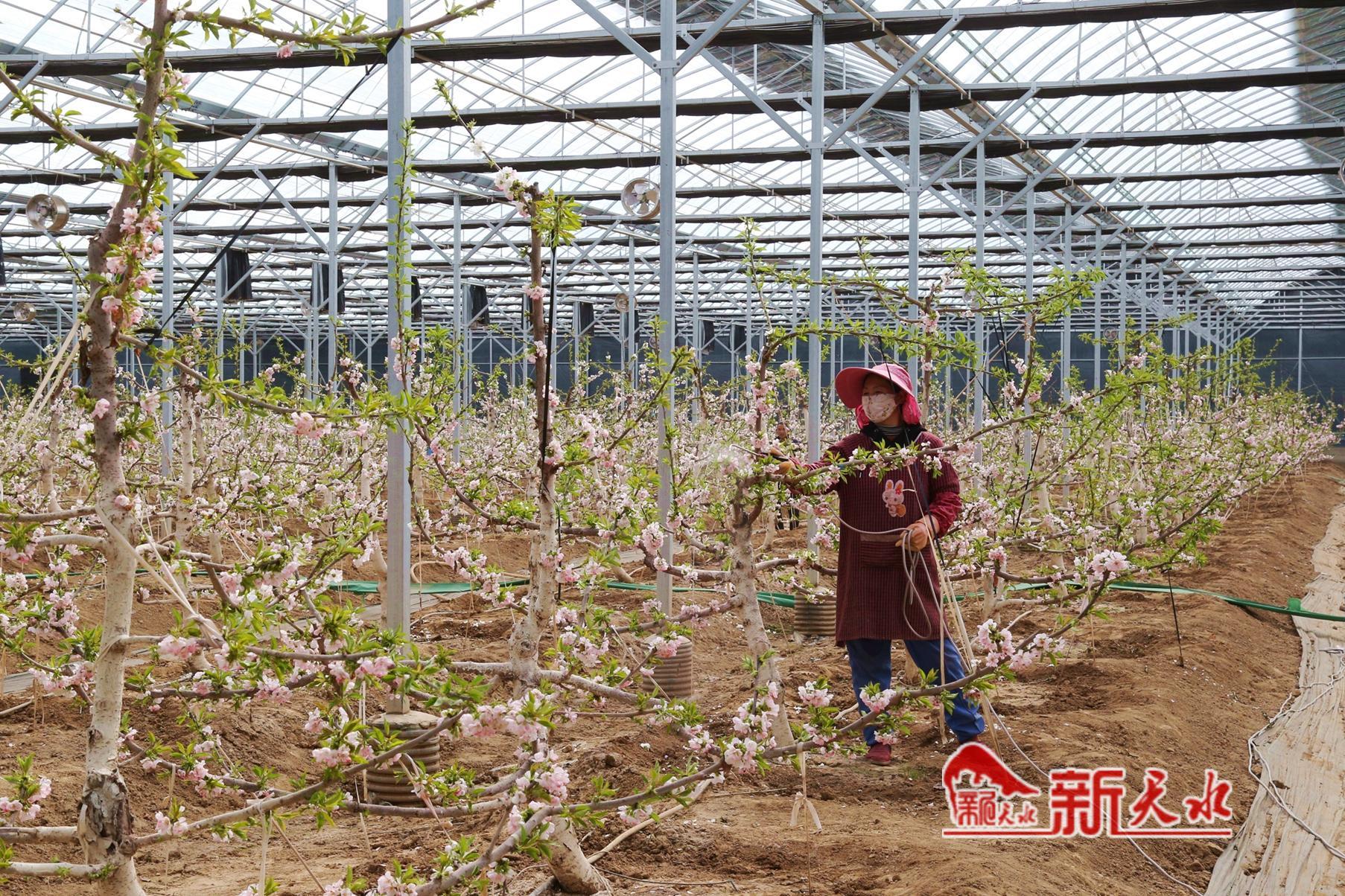 秦州區(qū)中梁鎮(zhèn)茹家灣村村民鄭紅紅拿著噴管,認(rèn)真為每朵花噴灑著授粉劑,在她身后,噴灑過(guò)的花朵由白變粉更顯嬌嫩?!艾F(xiàn)在是第一遍授粉,屬于花芽授粉,在櫻桃硬核期的時(shí)候還需要二次授粉,硬核期過(guò)一周再授第三次。這樣結(jié)出的櫻桃甜度高、個(gè)頭大、壞果少?!编嵓t紅介紹說(shuō),棚里主要種的是美早、含香兩個(gè)品種,預(yù)計(jì)4月中下旬就能全面上市,比大田櫻桃早上市一個(gè)半月。