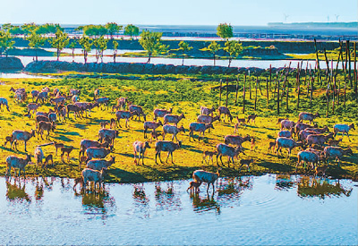 在江蘇省鹽城市大豐區(qū)黃海濕地野鹿蕩,成群麋鹿正在嬉戲、覓食。張連華攝(人民圖片)