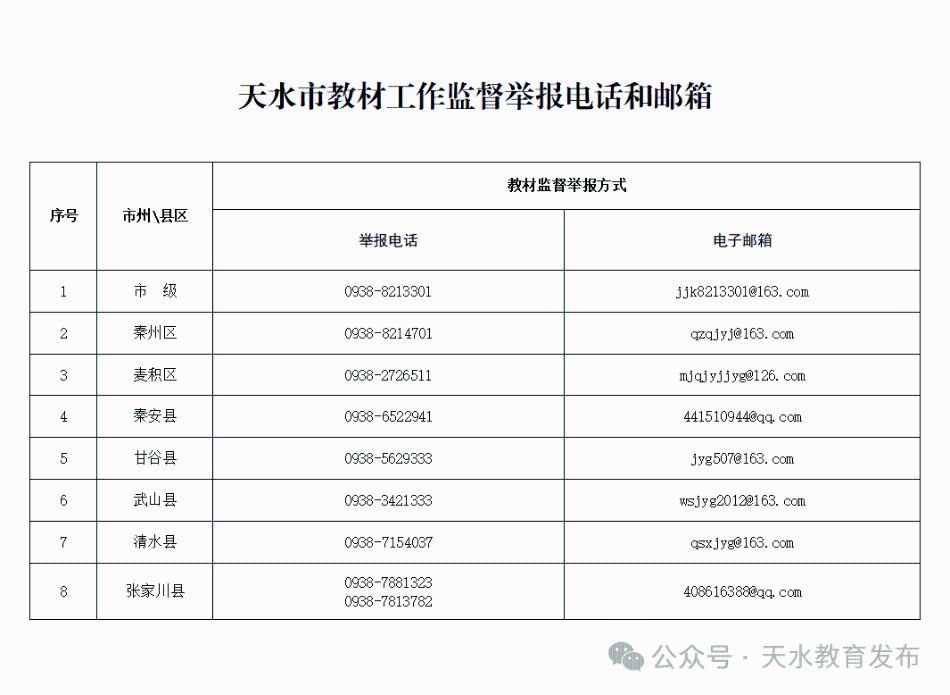 天水市教育局關(guān)于公布全市教材工作監(jiān)督舉報(bào)電話(huà)和郵箱的公告