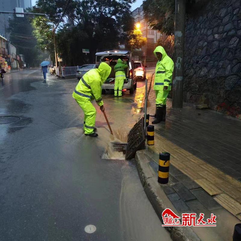 在城區(qū)各個易積水路段,市政人冒著大雨,奮戰(zhàn)在排水一線,采取打開排水井蓋、水篦子,或是清理堵塞的排水口垃圾,進行搶排,盡最大的努力,以最快的速度排除險情,有效避免了城市內澇災害,減少積水對市民生活的影響。