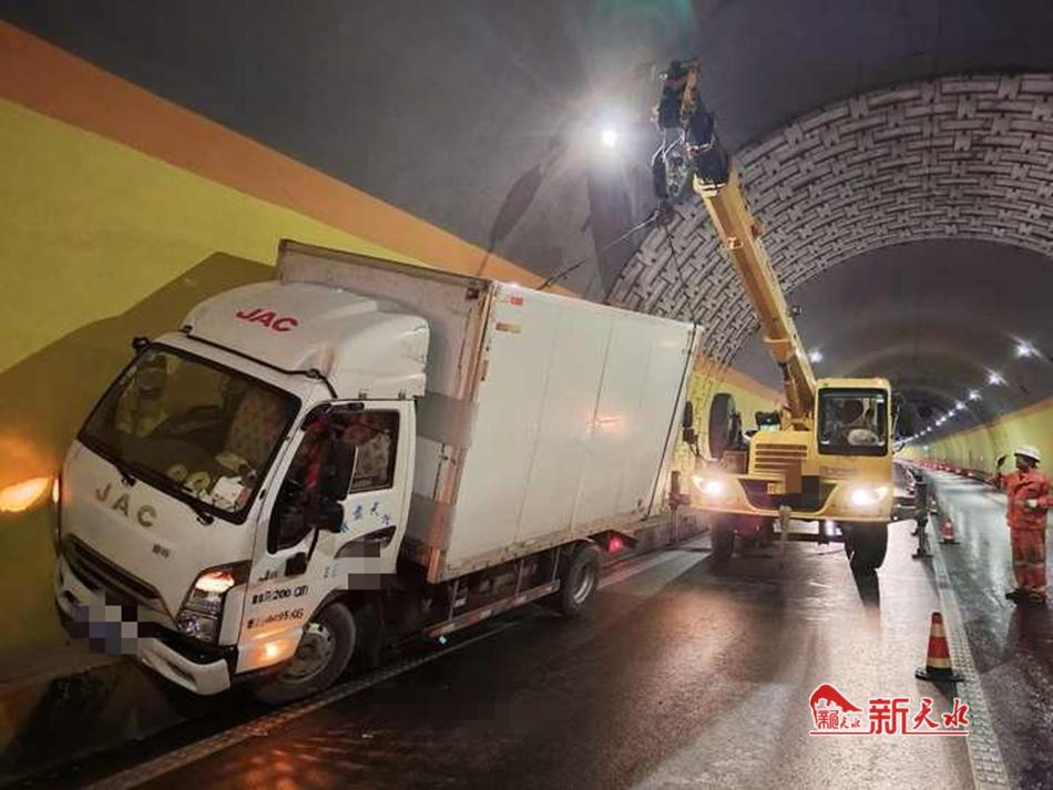 23日6時(shí)02分,G30連霍高速下行線寶雞方向K1430處發(fā)生一廂式貨車撞隧道壁事故。接報(bào)后,天水清障救援一大隊(duì)甘谷中隊(duì)人員快速趕赴現(xiàn)場。到達(dá)現(xiàn)場一方面做好現(xiàn)場安全防護(hù),另一方面配合交警勘察現(xiàn)場。由于該車右方向拉桿失靈,車橋后移,無法用板車拖拽,救援人員利用吊車將車輛從隧道壁吊裝至隧道內(nèi)行車道,再利用平板拖車鉤將車輛拖離高速公路,道路恢復(fù)正常通行。