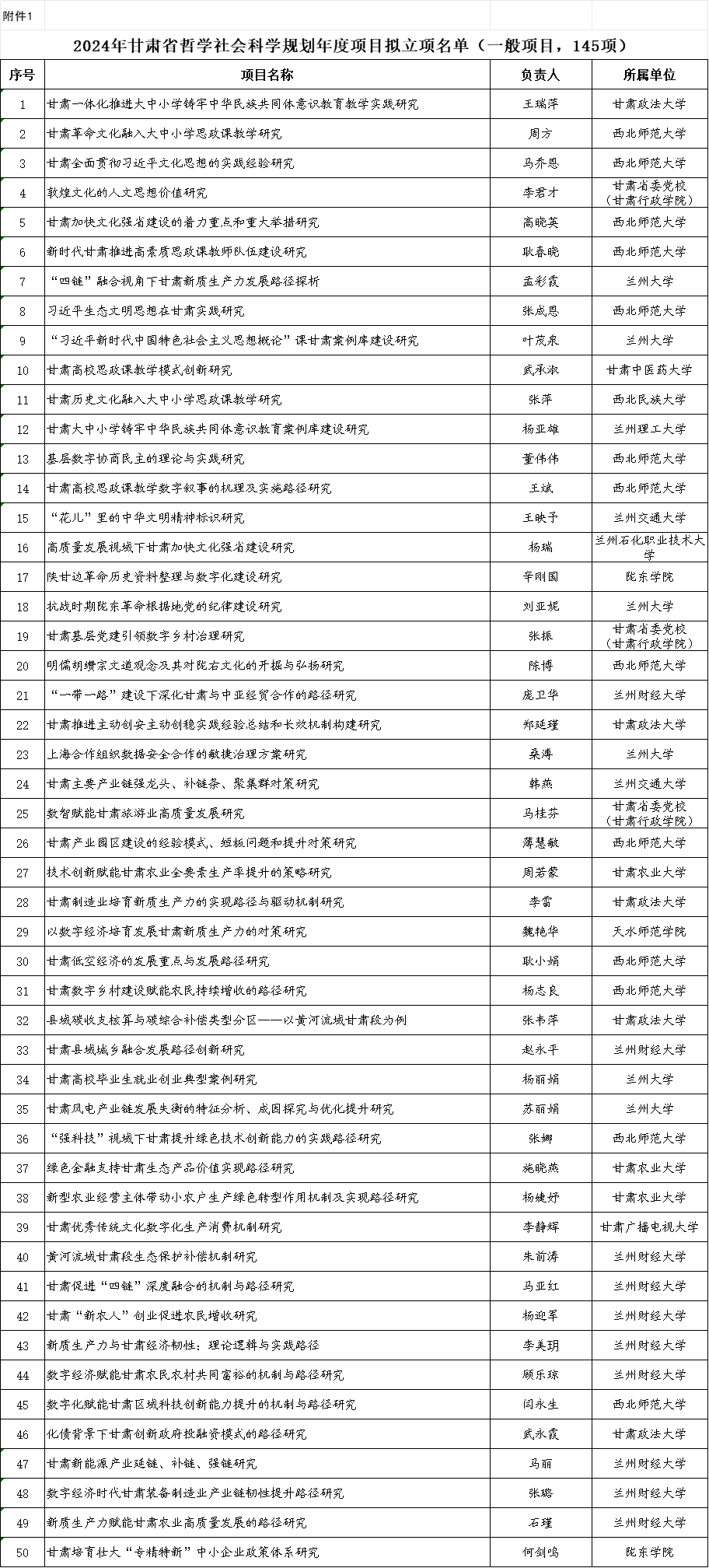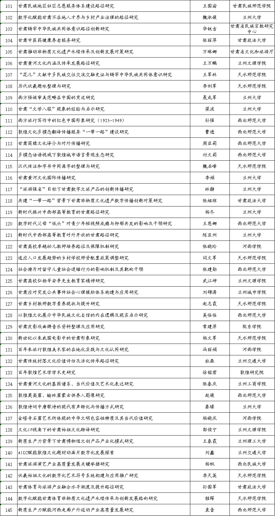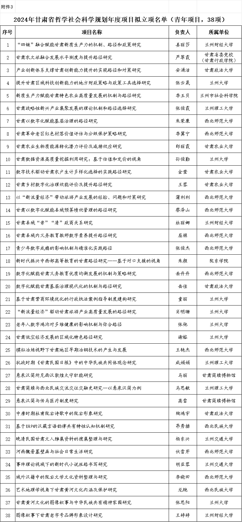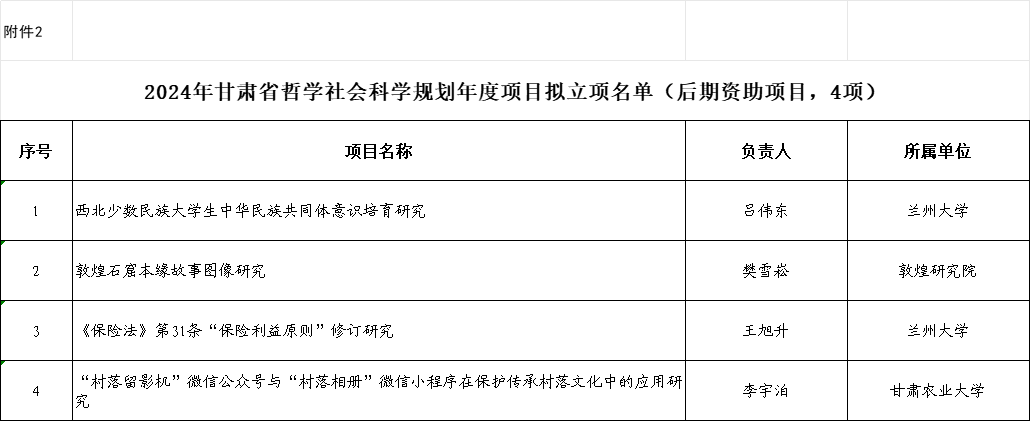 根據(jù)《甘肅省哲學(xué)社會(huì)科學(xué)規(guī)劃項(xiàng)目管理辦法》有關(guān)規(guī)定,經(jīng)中共甘肅省委宣傳部組織評審和會(huì)議研究,現(xiàn)將2024年省哲學(xué)社會(huì)科學(xué)規(guī)劃年度項(xiàng)目擬立項(xiàng)名單予以公示。公示時(shí)間為2024年9月2日至9月6日(5個(gè)工作日)。公示期間如有異議,請以書面形式向省委宣傳部反映,并提供必要的證據(jù)材料,以便核實(shí)查證。提出異議者須提供本人真實(shí)姓名、工作單位、聯(lián)系電話等有效聯(lián)系方式,凡匿名或超出期限的不予受理。