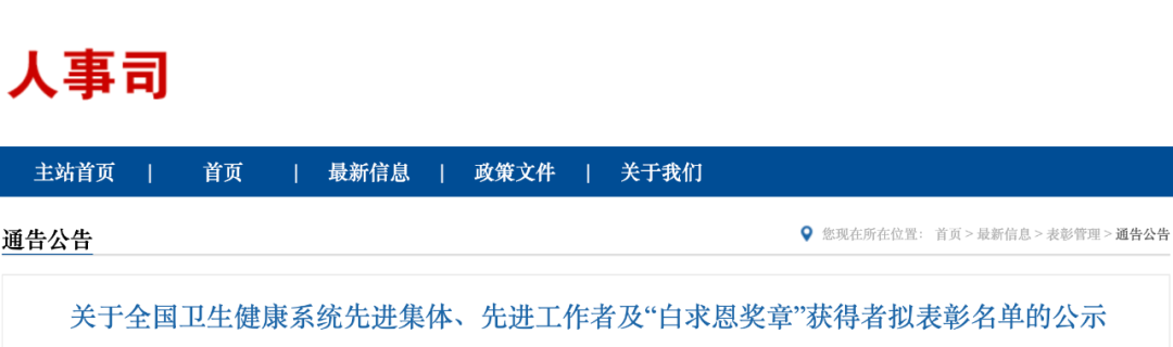 根據(jù)評選表彰工作安排,經(jīng)各省、自治區(qū)、直轄市和新疆生產(chǎn)建設(shè)兵團(tuán)人力資源社會保障部門、衛(wèi)生健康部門、中醫(yī)藥部門、疾控部門逐級推薦、評選,全國衛(wèi)生健康系統(tǒng)先進(jìn)集體、先進(jìn)工作者及“白求恩獎?wù)隆鲍@得者評選表彰領(lǐng)導(dǎo)小組辦公室審核,擬表彰“白求恩獎?wù)隆鲍@得者30名、全國衛(wèi)生健康系統(tǒng)先進(jìn)集體328個、先進(jìn)工作者752名,現(xiàn)予以公示。