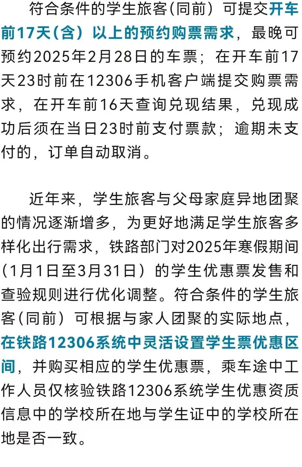 鐵路部門堅持以人民為中心的發(fā)展思想,落實便民利民惠民措施,在總結(jié)2024年春運學生預約購票工作經(jīng)驗的基礎上,科學分析出行規(guī)律,優(yōu)化鐵路12306系統(tǒng)功能,2025年春運期間繼續(xù)推出學生預約購票專區(qū)服務。2024年12月12日至2025年2月12日,符合條件的學生旅客(家庭居住地與學校所在地不在同一城市,已通過學生優(yōu)惠資質(zhì)核驗且有剩余優(yōu)惠次數(shù)),可在鐵路12306手機客戶端“學生預約購票專項服務”專區(qū),預約購買2024年12月28日至2025年2月28日的火車票,同一賬戶最多可同時提交3個訂單,每個訂單可添加1個乘車日期的5個“車次+席別”的組合,可選席別為學生優(yōu)惠票適用的硬座、硬臥、二等座,最多可為包含本人在內(nèi)的9名學生旅客預約。