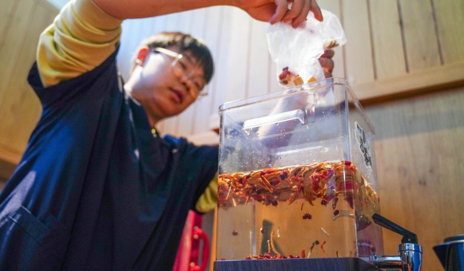 12月2日,北大湖滑雪度假區(qū)中醫(yī)康養(yǎng)館的工作人員正在煮制“人參元?dú)怙嫛?。新華社記者 王帆 攝