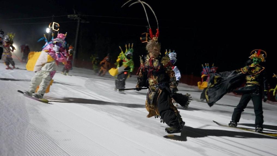 夜幕降臨,在吉林市萬科松花湖度假區(qū),20名身著京劇、川劇等服飾的滑雪愛好者從山頂飛馳而下,在煙火映襯下英姿颯爽,引來陣陣歡呼。