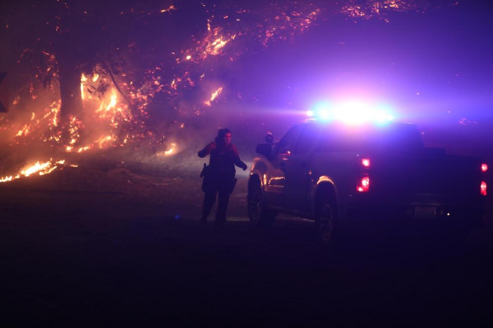 1月7日,一名警察在美國加利福尼亞州南部洛杉磯縣沿海社區(qū)帕西菲克帕利塞茲的野火旁工作。新華社發(fā)(邱晨攝)