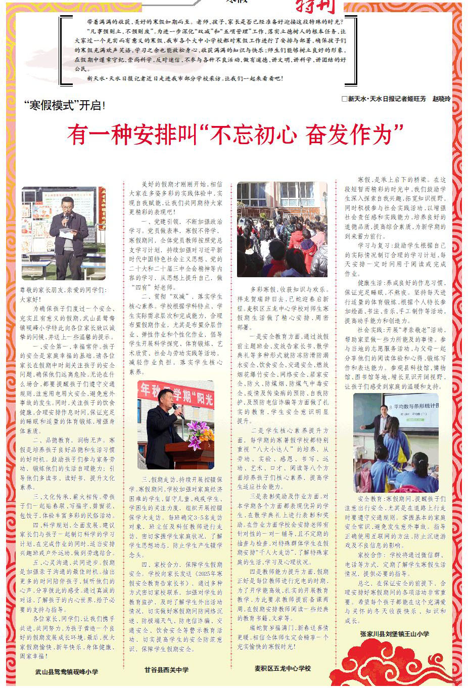多彩寒假,收獲知識與歡樂。祥龍賀瑞辭舊去,已蛇迎春啟新程。麥積區(qū)五龍中心學校對師生寒假期生活做了精心安排,周密部署。