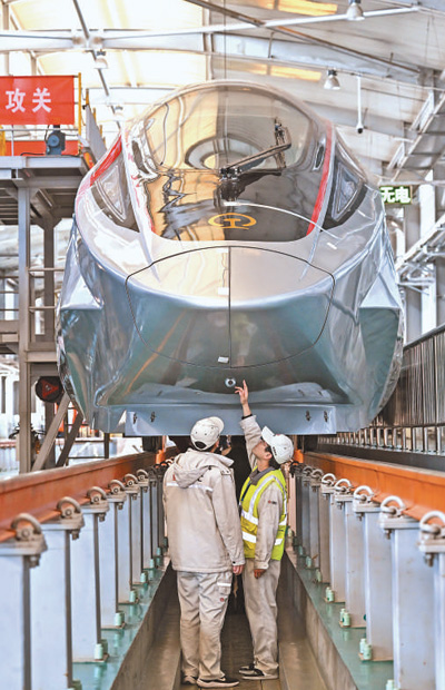 2月25日,工作人員在中國鐵道科學(xué)研究院國家鐵道試驗中心對CR450動車組樣車進(jìn)行試驗驗證。去年底,運營時速400公里的高鐵列車CR450動車組樣車在北京發(fā)布,目前相關(guān)團(tuán)隊正在開展一系列科學(xué)試驗和性能驗證,為動車投入商業(yè)運營創(chuàng)造條件。