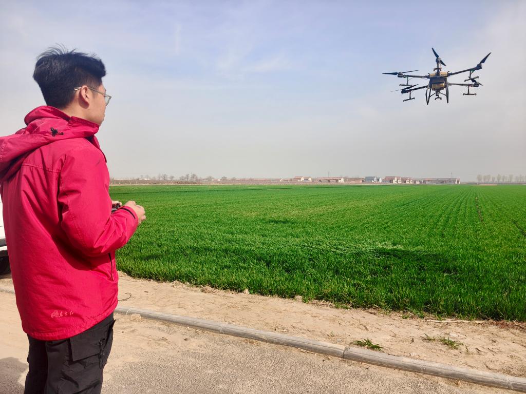 3月26日,在山西省運(yùn)城市萬(wàn)榮縣榮河鎮(zhèn),丁澤輝在操作植保無(wú)人機(jī)。新華社記者 王皓 攝