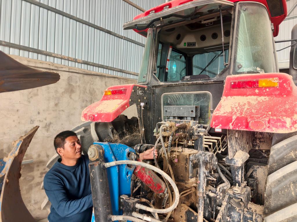 3月26日,在山西省運(yùn)城市萬(wàn)榮縣榮河鎮(zhèn),丁全偉在檢修農(nóng)機(jī)。新華社記者 王皓 攝