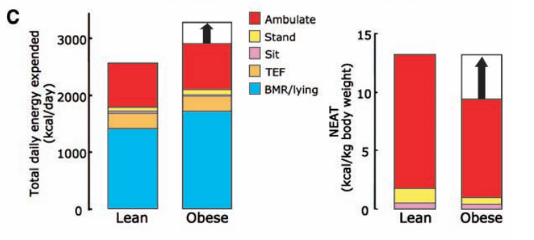 瘦人和胖人比較不同運(yùn)動(dòng)習(xí)慣能力消耗情況(JA Levine et al, 2005)注:TEF:食物熱效應(yīng);NEAT:非運(yùn)動(dòng)活動(dòng)熱生成;BMR:基礎(chǔ)代謝率