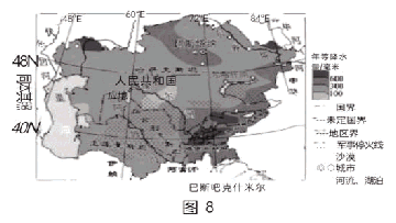中亞地處亞歐大陸中部,與我國新疆相鄰,地理環(huán)境相似。近些年來,該地區(qū)人口增長迅速,水資源的高效利用成為各國關(guān)注的重點(diǎn)。中亞國家積極尋求與我國新疆在滴灌技術(shù)方面的合作,較好地促進(jìn)了當(dāng)?shù)氐霓r(nóng)業(yè)發(fā)展。圖8示意中亞降水及城市分布。