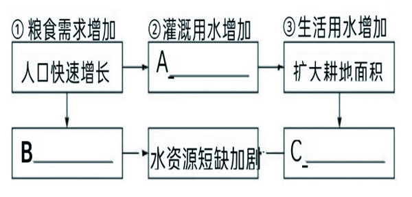 (2)請(qǐng)將上面右圖內(nèi)容的序號(hào)填入對(duì)應(yīng)的空格內(nèi),完成“中亞人口快速增長與水資源短缺加劇關(guān)系”的框圖。(3分)